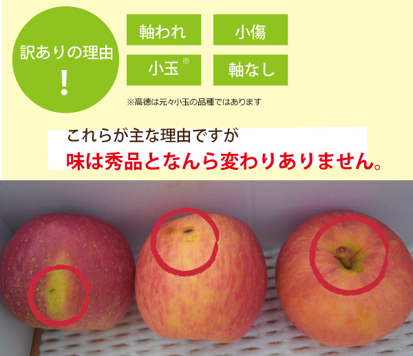 じく割れ・小キズ・着色不良・サビあり・小玉(高徳は元々小玉の品種ではあります。)などのりんごが入りますが、美味しいりんごに変わりありません。